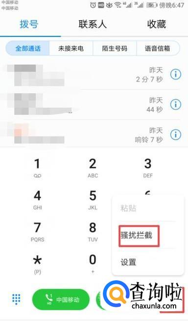 弹出的界面,我们点击右下角的设置,弹出的界面,我们点击骚扰拦截;