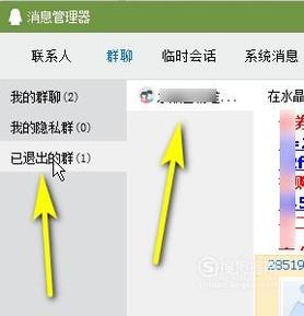 下面展开有关群聊的内容,在左侧的菜单中再点:已退出的群;右边即弹出已退出的群的信息。