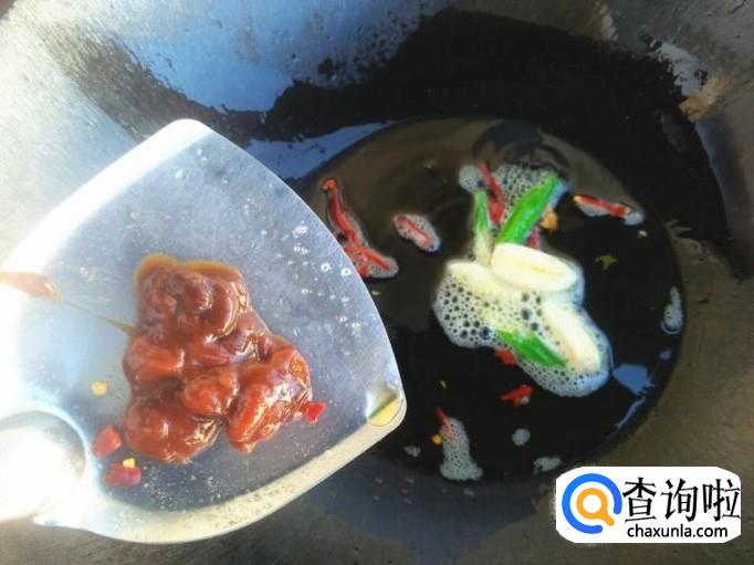 葱蒜在油里面爆香之后,一大勺子豆瓣酱放进锅里,豆瓣酱的选择很重要,不要买那些干干的黑乎乎的豆瓣酱,价格是便宜,但是不好吃。