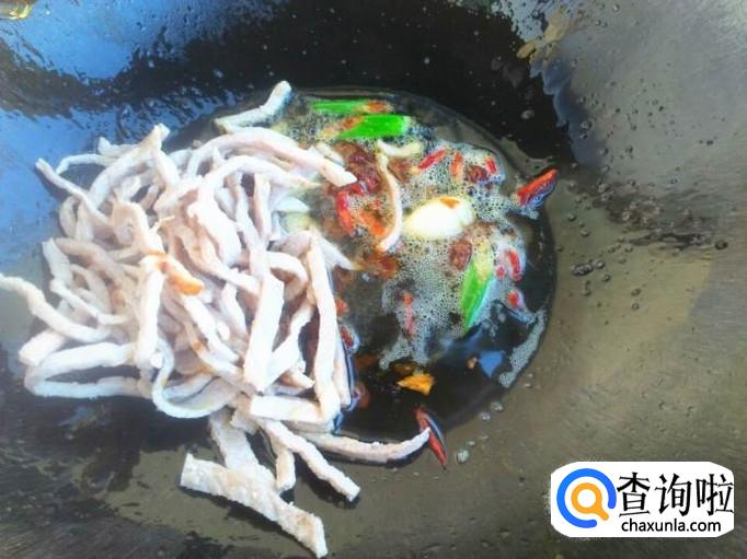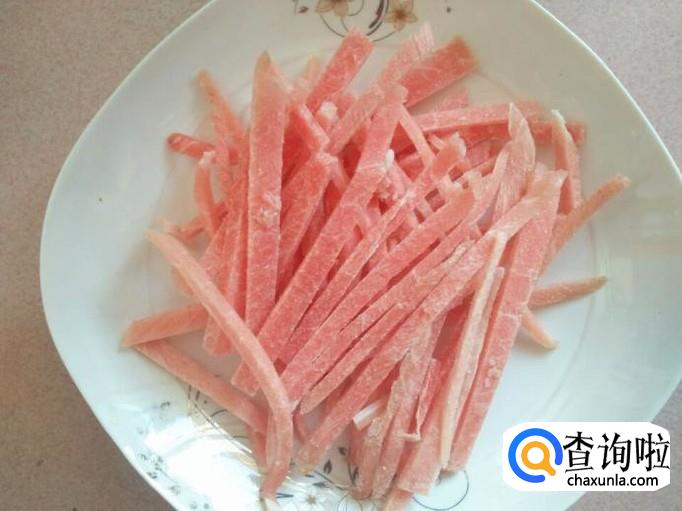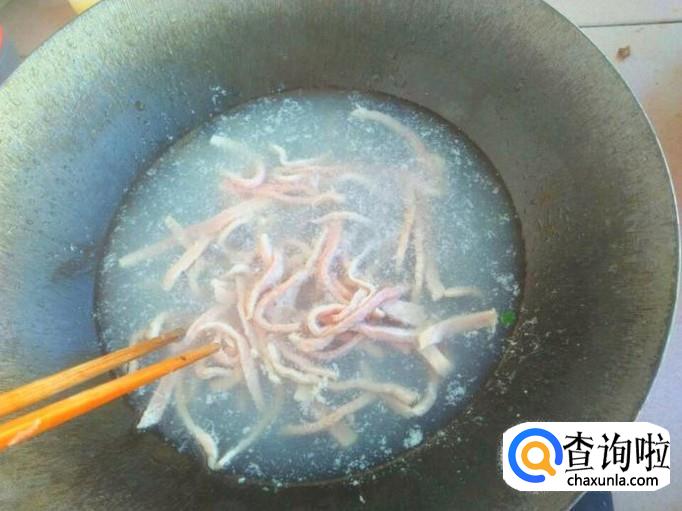 肉丝化冻之后,锅里烧开水,把肉丝投放进去快速转几圈捞出来,控干水分,这样炒出来的肉丝保证和平常的那种炒法口感完全不同,外观也是很好看的。