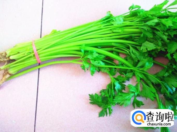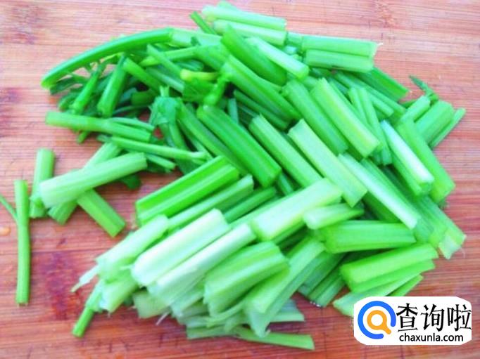 芹菜去老叶子和根,清洗干净,浸泡在清水里半小时,控干水之后切成段。
