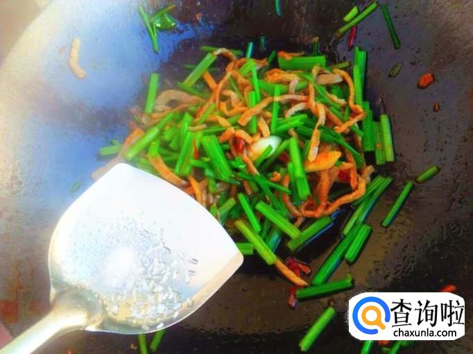 快速翻炒,这过程中不加一滴水,芹菜稍加变色的时候加上食盐和一点味素调味。