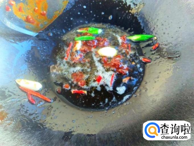 用小火慢慢的熬一分钟,让豆瓣酱和葱蒜以及植物油完美融合在一起,嗯,这个词用的很好。