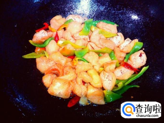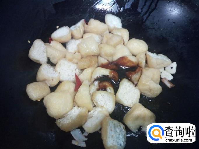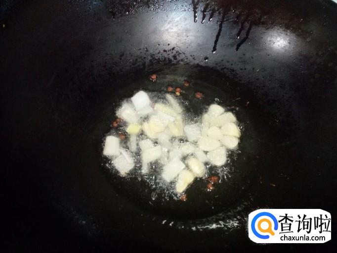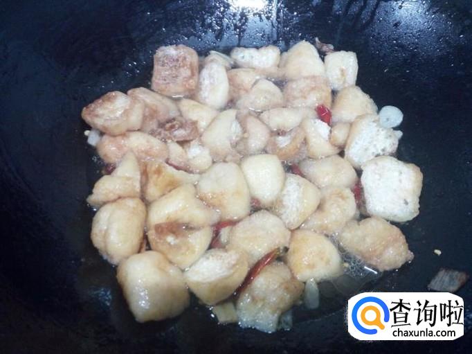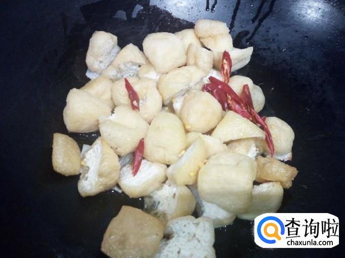 锅里放入油加热,油热后放入花椒,葱,姜,蒜爆锅。放入豆泡,红干椒翻炒。
