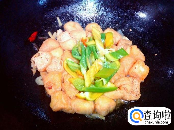 收汤汁后放入青椒,放入少许盐略翻炒一下。放入少许味精,关火出勺。