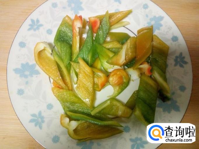 青椒用水清洗干净,控干水分,切成片。这个青椒有点红色,不是刻意选用的红椒。