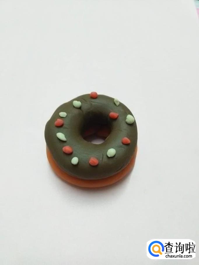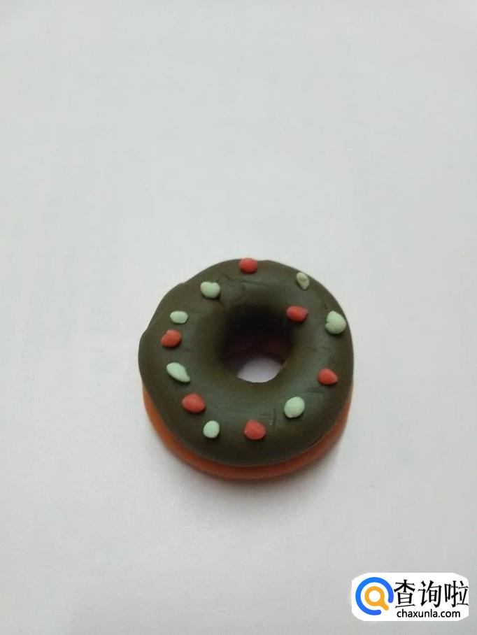 用红色和白色团许多细小的球,粘在棕色圆圈上面,当作糖粒,甜甜圈就做好了。