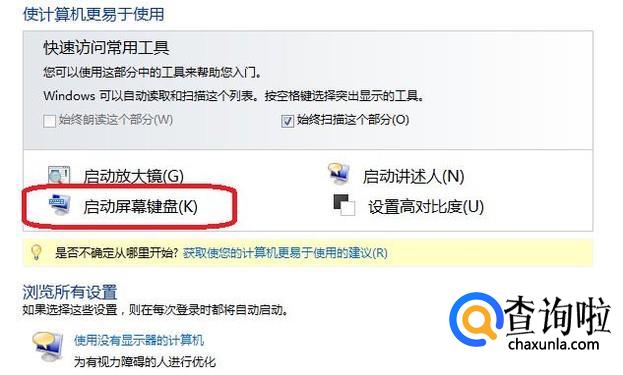 打开轻松访问中心,就能看到“启动屏幕键盘”按钮了,如图所示,点击一下就能开启。