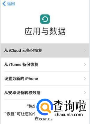 当看到“应用与数据”时,点击“从iCloud云备份恢复”。