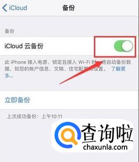 手机连接上WiFi,然后在手机“设置”中,依次点击“Apple ID——iCloud——iCloud云备份”,开启iCloud云备份功能,再点击“立即备份”。