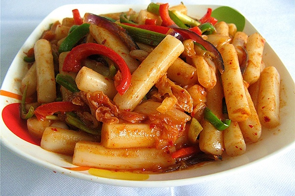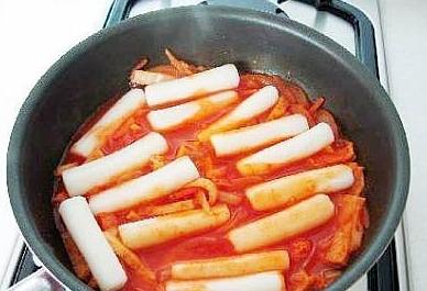 准备材料:年糕片(或年糕条,自己个人口味准备),辣白菜(宗家府牌,本人认为这个牌子的味道正宗),圆白菜,韩式辣酱,洋葱,蒜。做法:洋葱半颗切好备用,圆白菜小半颗切丝(不要太细),蒜四瓣切片;热锅倒入色拉油少许,油温八成热时放入洋葱和蒜爆香,洋葱变软后放入辣酱翻炒,之后倒入一碗清水,煮沸后倒入年糕片继续煮,煮沸后继续加入圆白菜,待圆白菜变软后加入辣白菜继续煮(小火);大概五分钟后尝一下年糕片,如果口感很Q的话就OK了,这时可以调成大火让菜开始收汁,收汁后即可出锅装盘了。