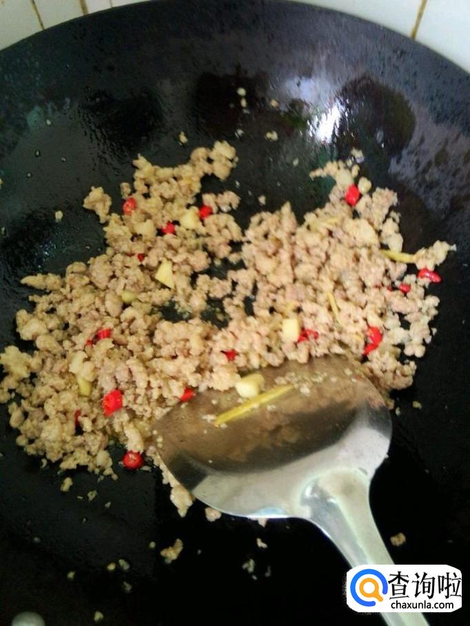 将小葱洗净切碎,将榨菜切碎备用。锅中放入适量植物油,油热后倒入准备好的肉末,放适量食用盐,再放少量酱油上色,适量鸡粉提鲜,炒熟后关火。