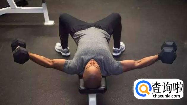 哑铃飞鸟锻炼胸肌外侧,肘部略微弯曲,哑铃慢慢降低到两侧。 在最低点,上臂和长凳基本处于同一水平,肘部弯曲约90度,胸部肌肉完全伸展。 哑铃应缓慢降低,同时吸气, 抬高肋骨的下缘,尽可能地拉伸胸部肌肉。