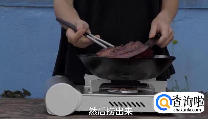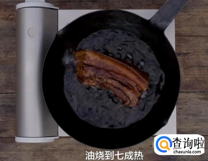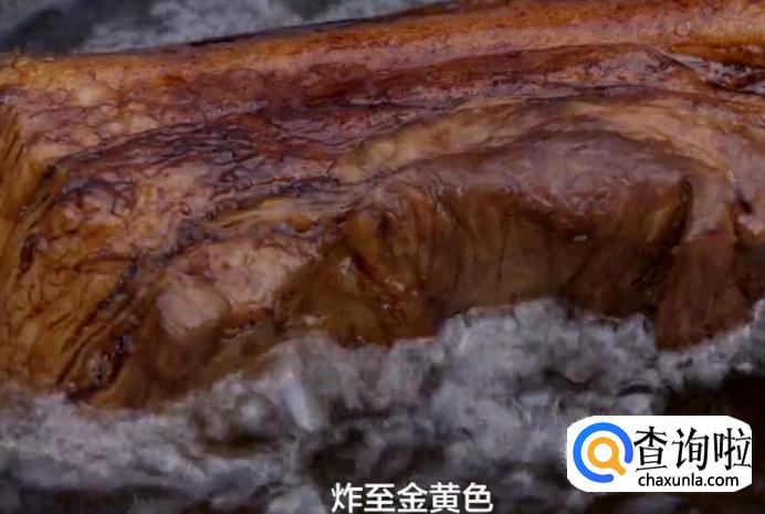 热锅起油,油烧到7成热的时候,放入腌好的五花肉放进去,榨至金黄色。