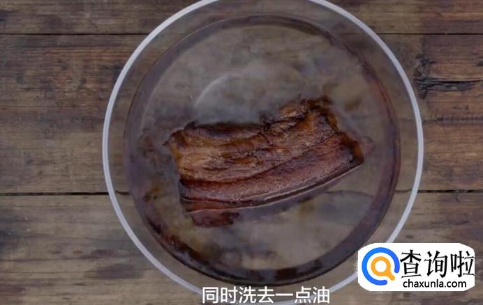 将捞出来的五花肉放入冷水中冷却,同时洗去一点油。