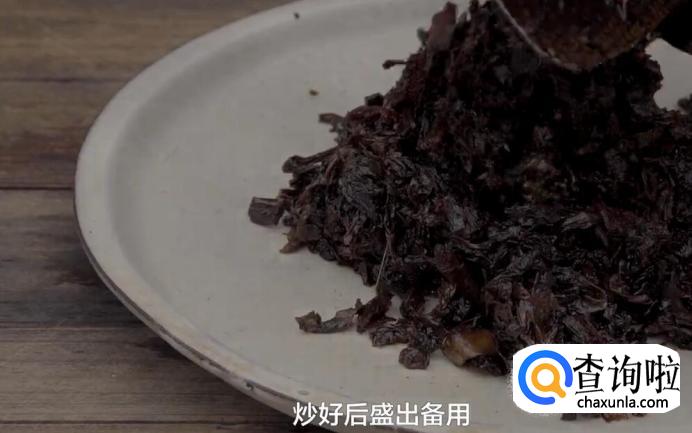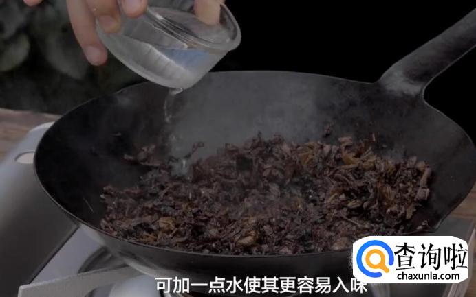 将梅菜的水沥干,倒入油锅内。