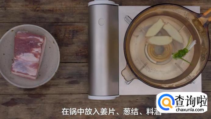 先在锅中倒入清水,放入姜片、葱结和料酒。