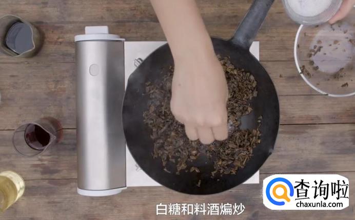 再加少许老抽、生抽、白糖和料酒煸炒。