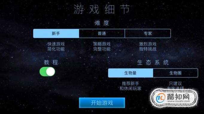 接下来选择游戏细节,关于游戏难度,生态系统等选择,建议不要选择新手,因为有很多功能你没法体验。