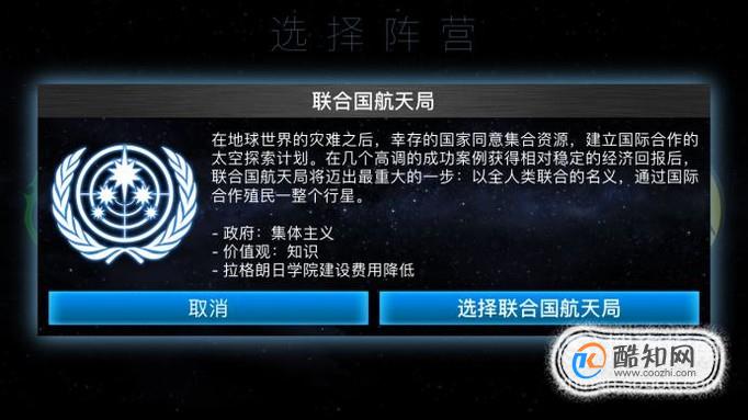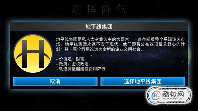 联合国航天局你可以看做是人类去外太空殖民,地平线集团就是大哥大,有钱,财富多。你喜欢以上哪个阵营就选择,不想选就点击取消。