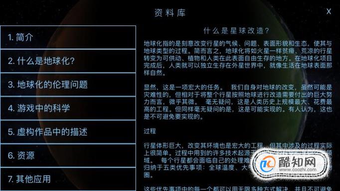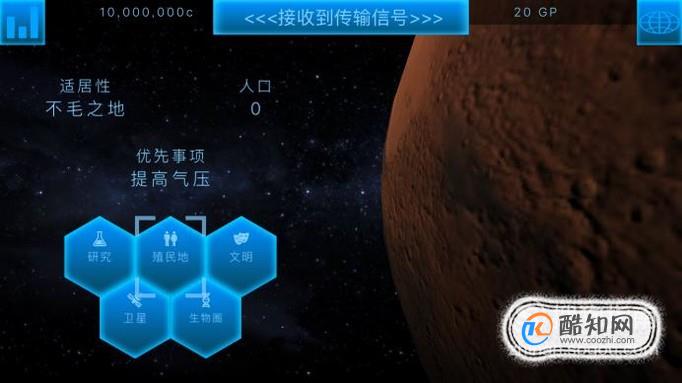 自此你终于进入了游戏主界面了,在这里,你就可以开始你的外太空殖民了,你可以熟读里边理论知识,让你更加快速上手。