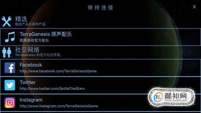 回到主界面,还有另外一个按钮——连接,点击连接可以查看原创音乐,还可以连接游戏的社交账号,因为是国外开发商,所以都是些我们不能登录的平台。