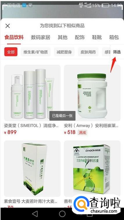 找到的商品就会显示出来啦,如果都不是自己想要的可以点击后面的“筛选”,找到大类类目,照片最好是照物品全身,或者商标,这样“京东的拍照购”会更容易识别你要的商品。