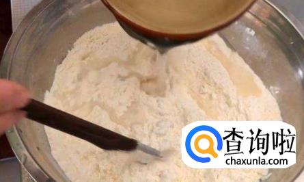 面粉倒在和面盆里摊开,磕入鸡蛋,与面粉掺匀,然后一边慢慢倒入清水,一边搅拌。