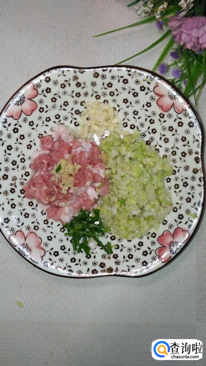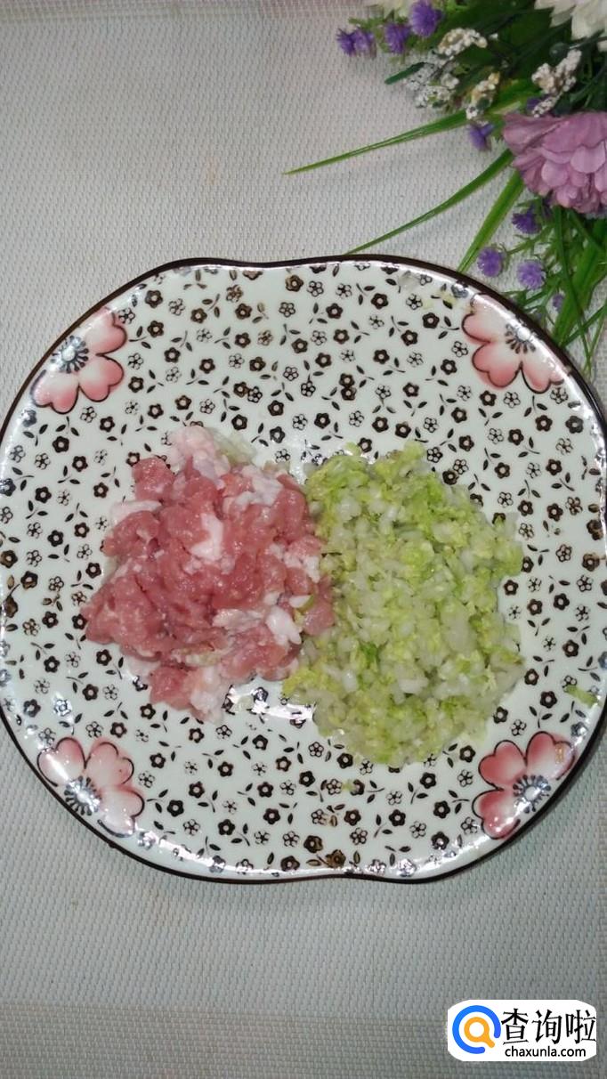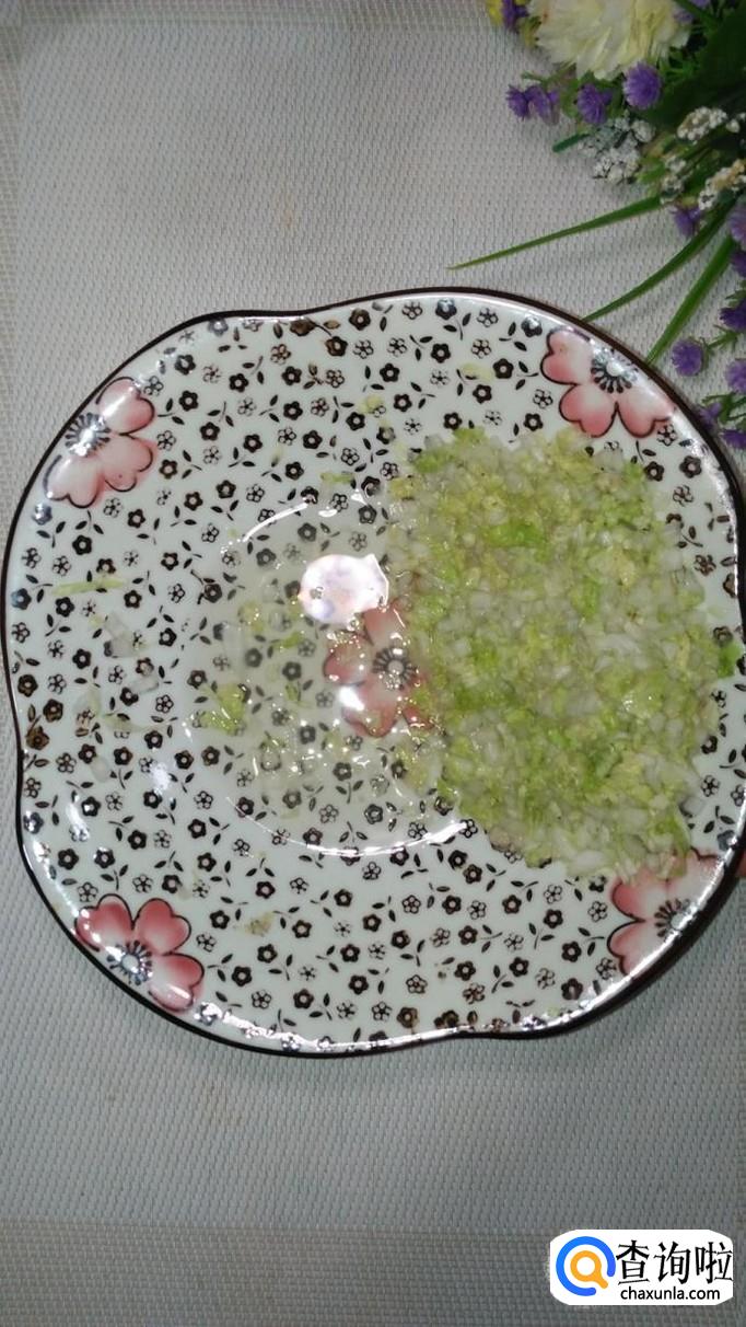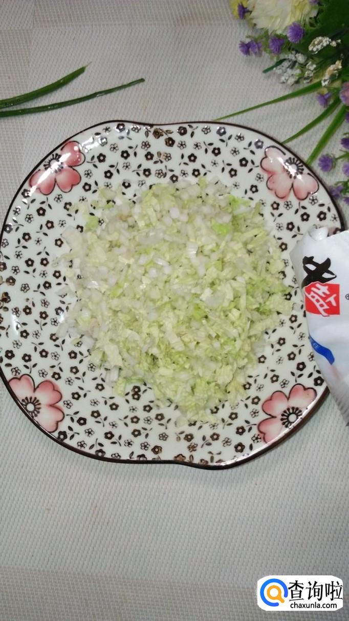 准备适量白菜,洗净后切碎,加入适量盐,大约腌10分钟左右,腌去水分,用手捏一下,将多余的水分倒掉。