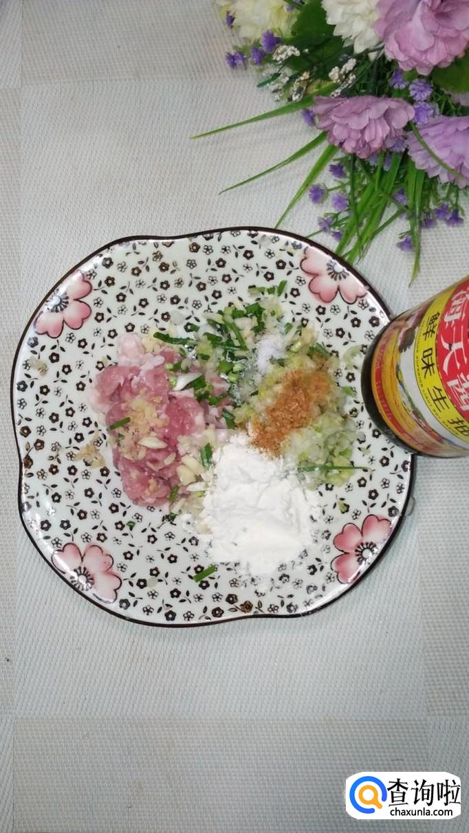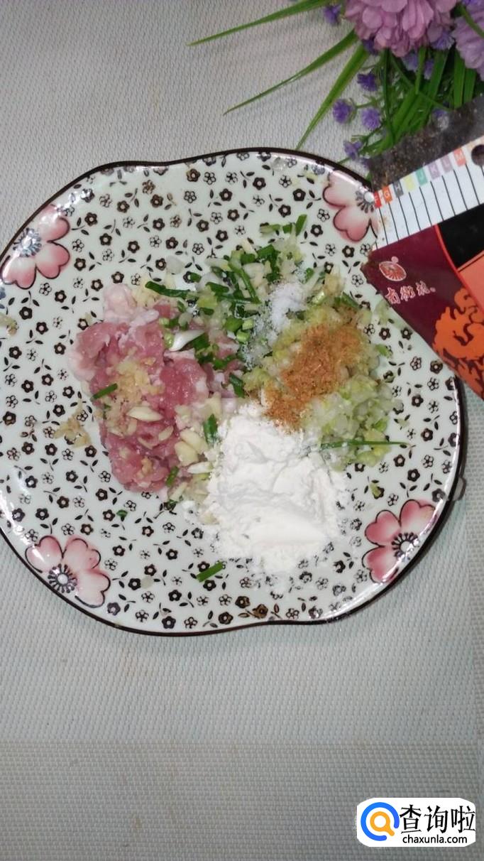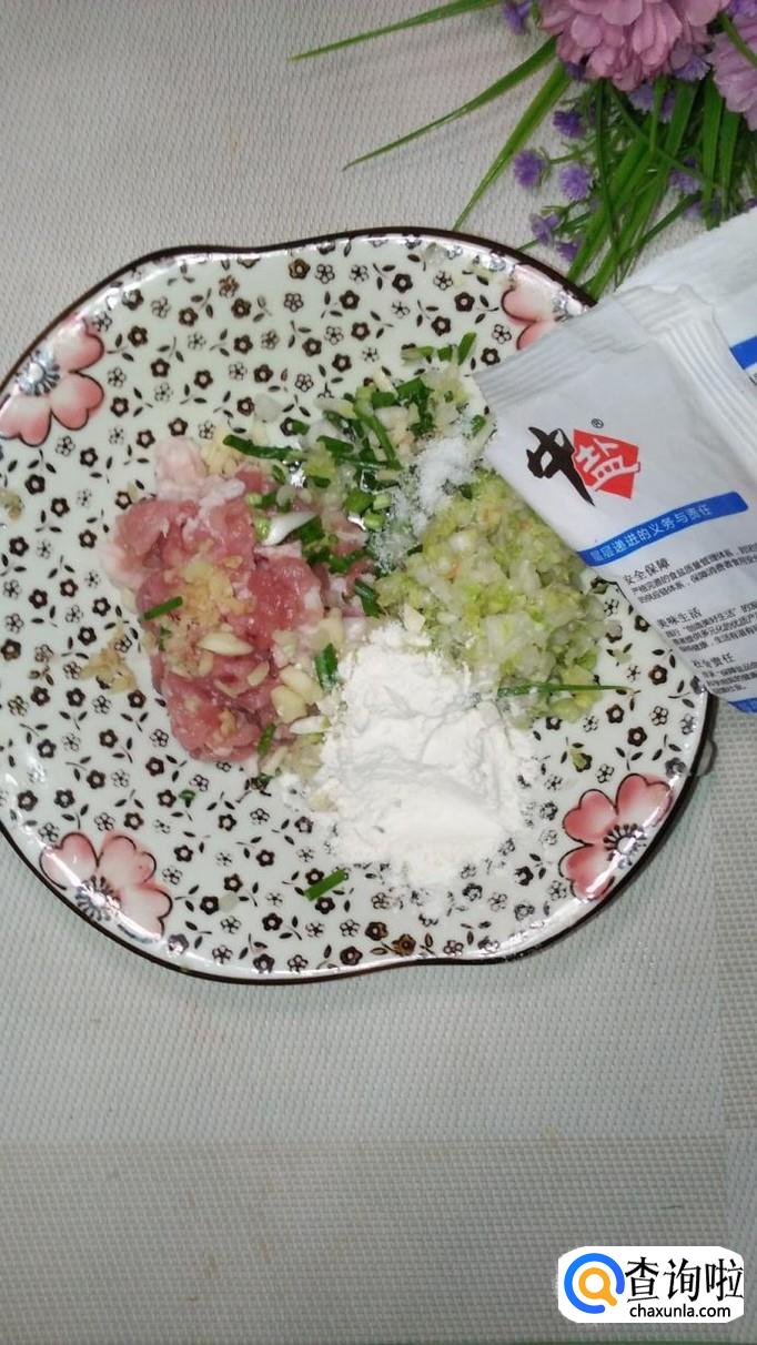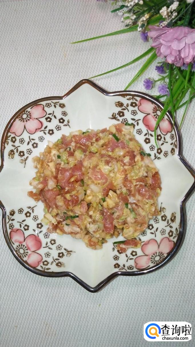 准备适量白菜,洗净后切碎,加入适量盐,大约腌10分钟左右,腌去水分,用手捏一下,将多余的水分倒掉。