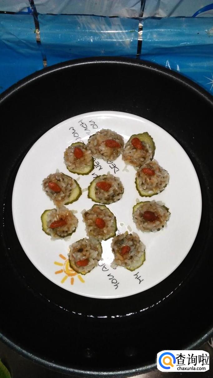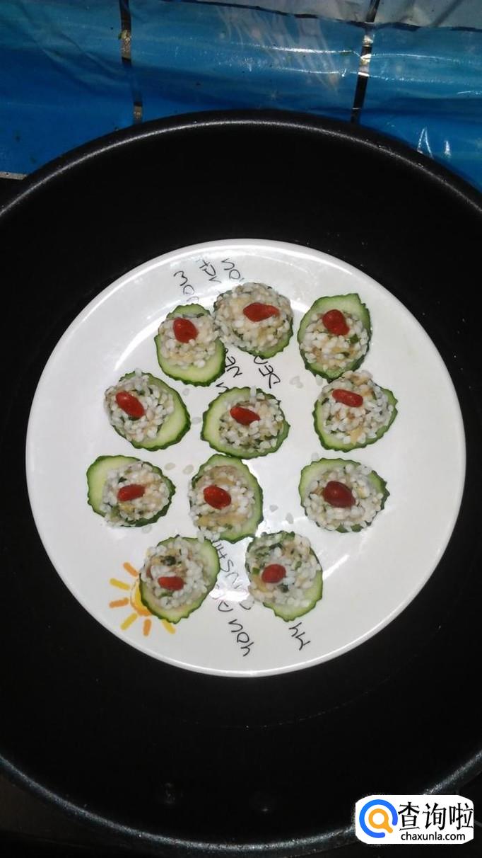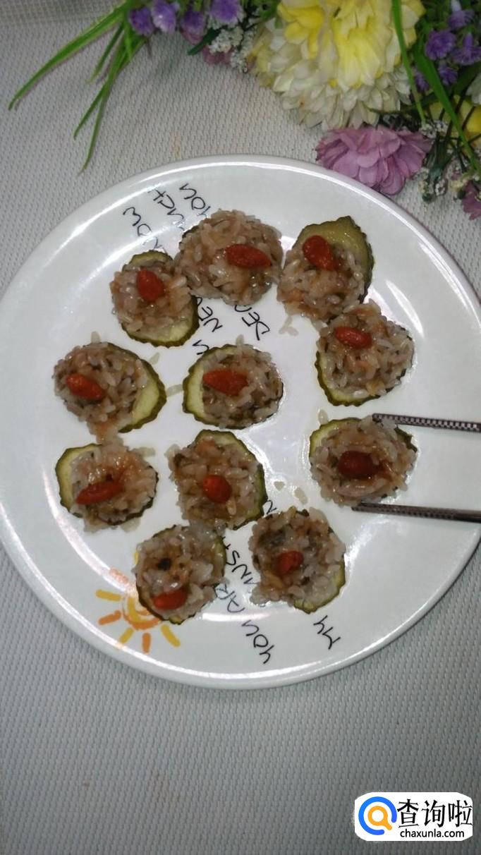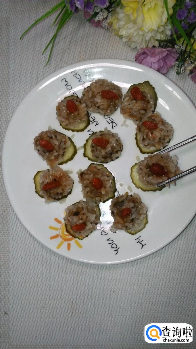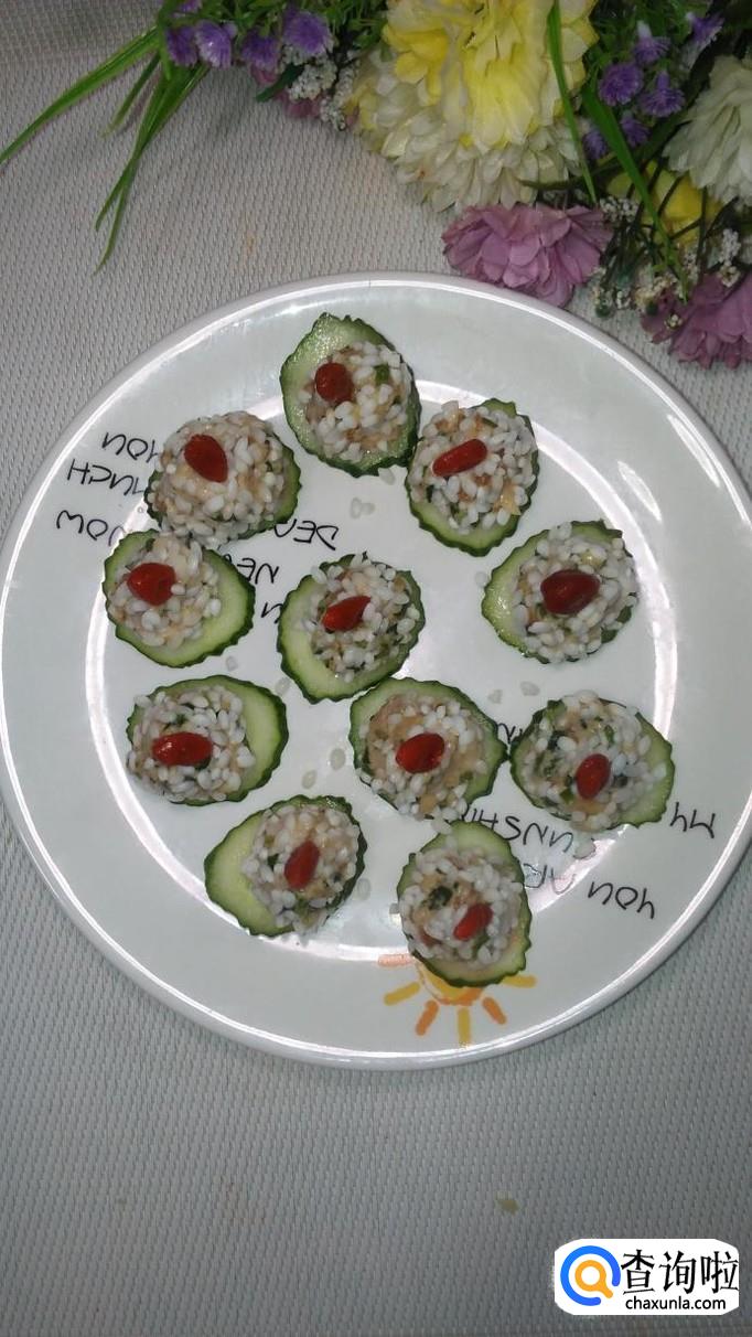 准备适量黄瓜洗净,用刀切成片放在盘中,将白菜肉馅团成丸子,滚上一层糯米,放在黄瓜片上。再准备适量枸杞子,用清水泡开,将枸杞子点缀在丸子上面。