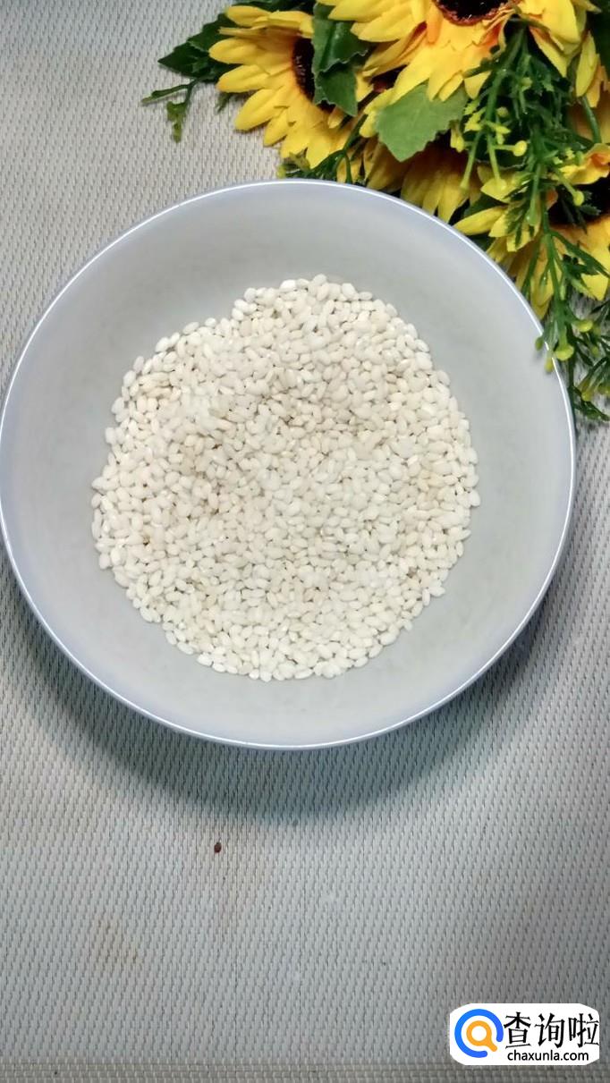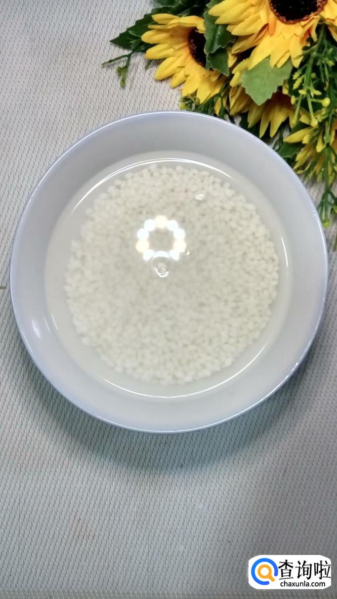 准备适量的糯米,用清水泡四个小时以上,泡至糯米变大,用手可以轻轻捏碎就可以了。