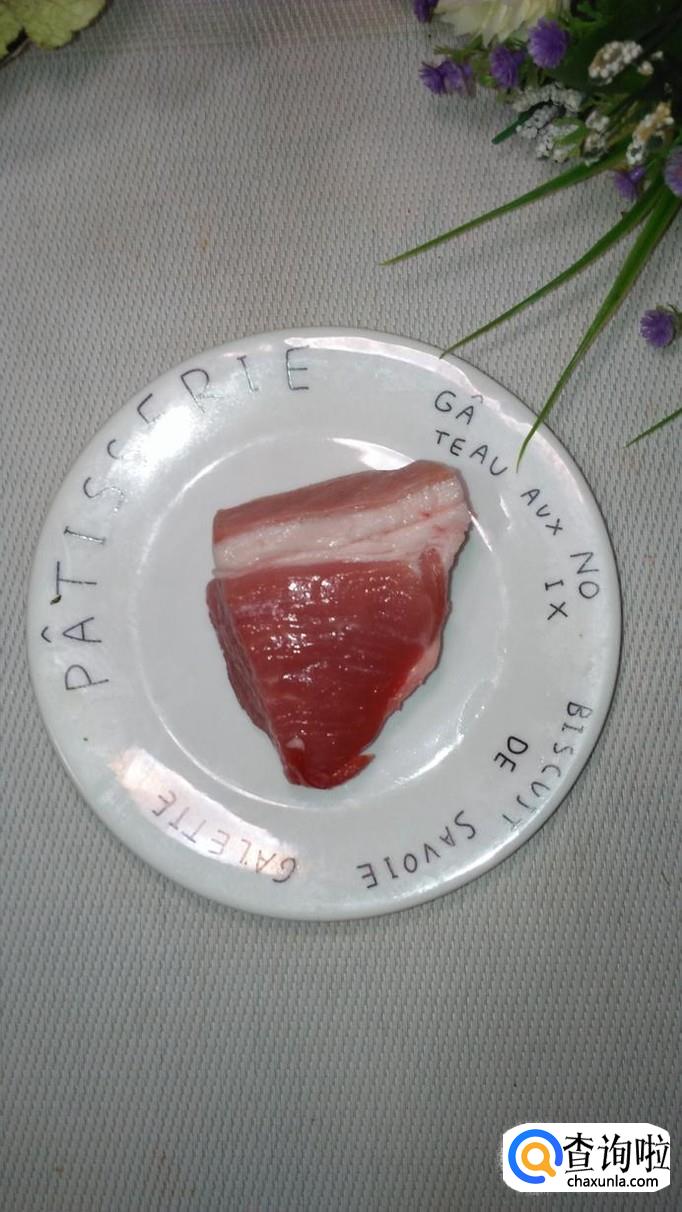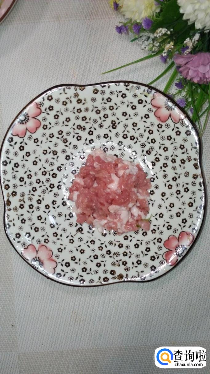 准备一块五花肉,洗净后切碎,放入盘中备用。注意,一定要选择新鲜的五花肉,五花肉肥瘦间隔,这部分瘦肉是最嫩最多汁的。
