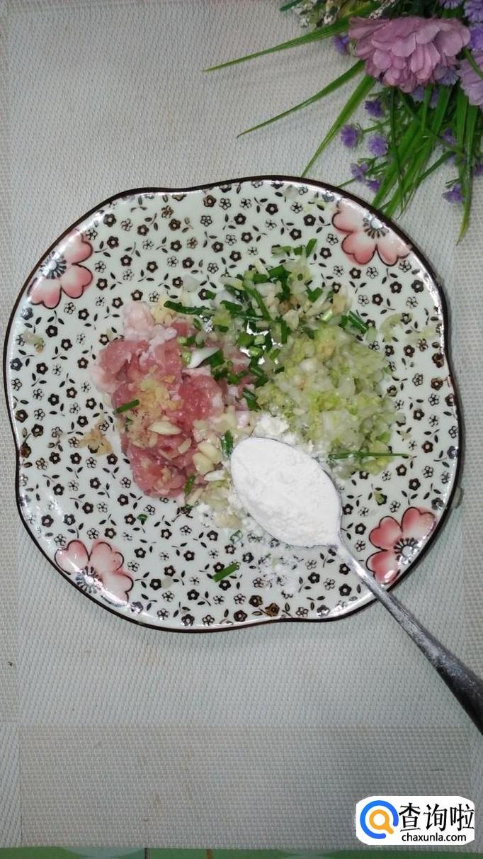 五花肉和白菜碎放在一起,再准备适量葱,姜,蒜,洗净后切碎,放入盘中,再加入一勺淀粉。