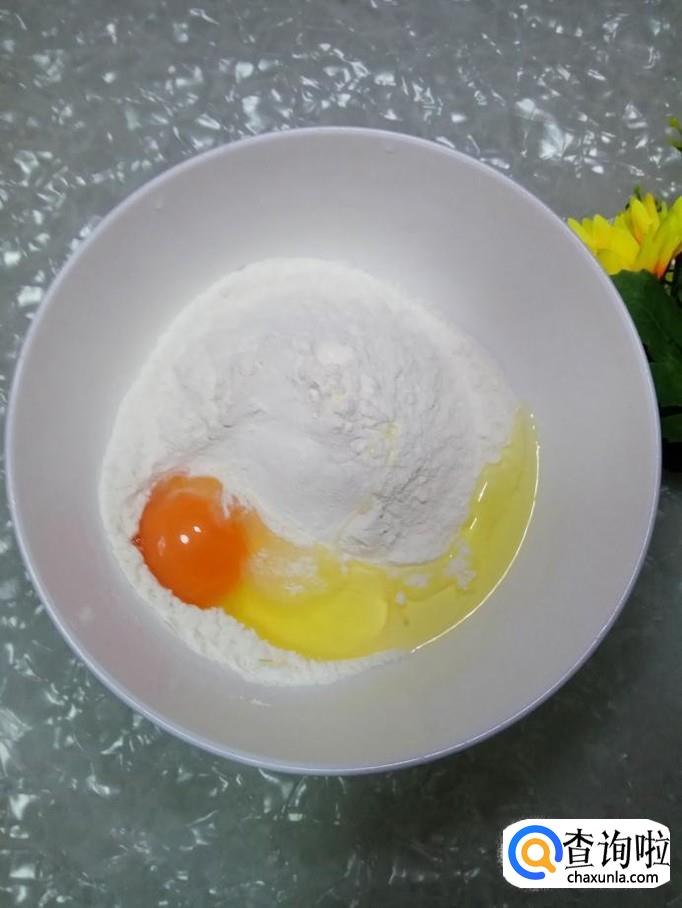 在碗中放入200克面粉,打入一个鸡蛋。
