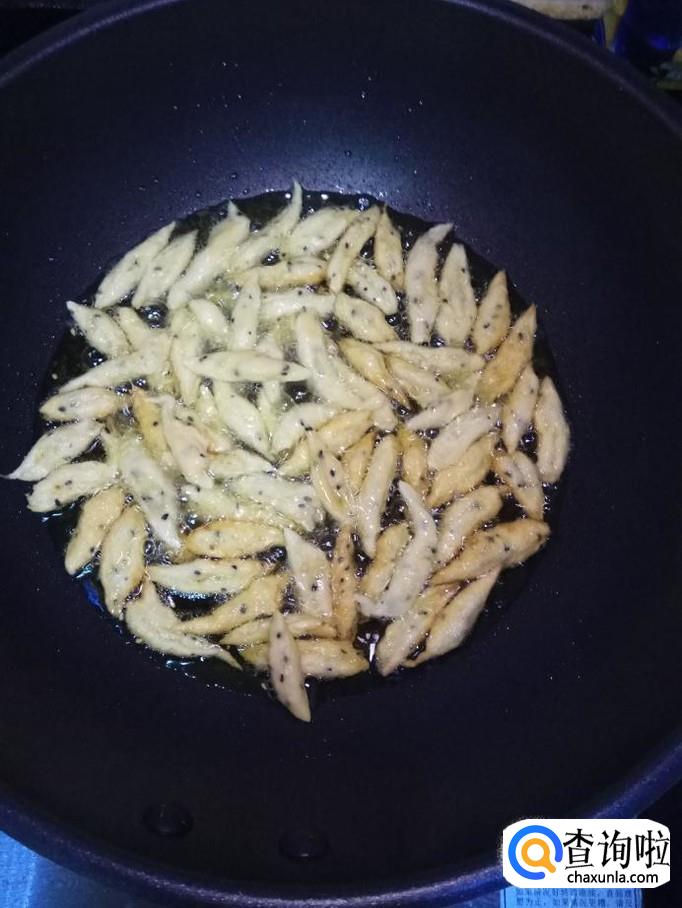 炒锅放油,油温五成热,放入小面鱼,小火慢炸。一定要有耐心,可以来回翻一下。