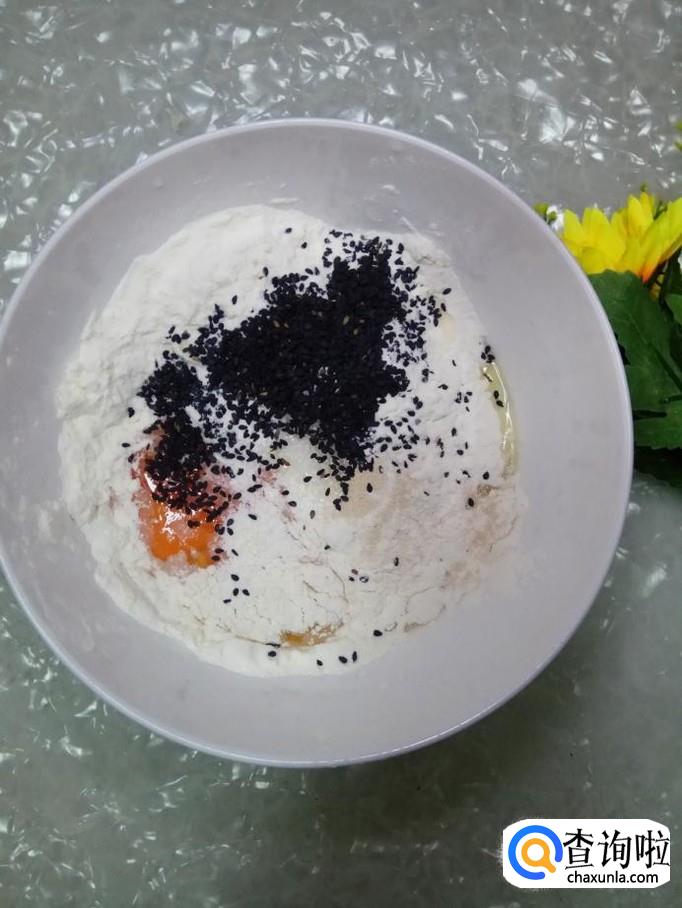放入三克酵母粉,一勺白砂糖,再放适量白芝麻。