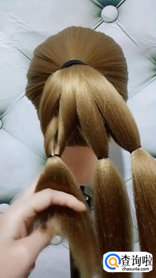 将马尾辫分成三股,在辫子的中间位置扎成三个小辫子。