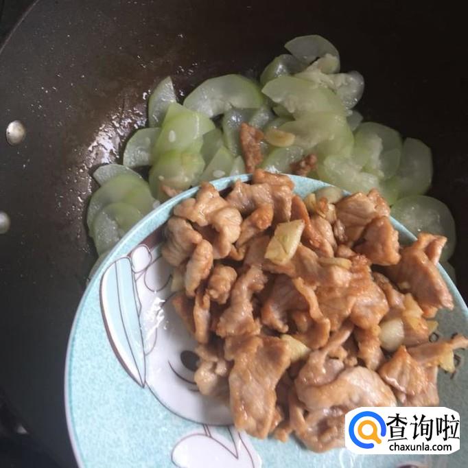 接着把事先炒好的瘦肉倒入锅中和西葫芦一起翻炒三分钟。