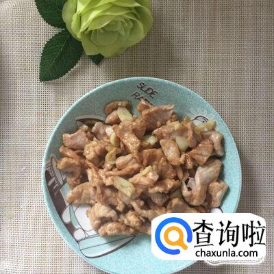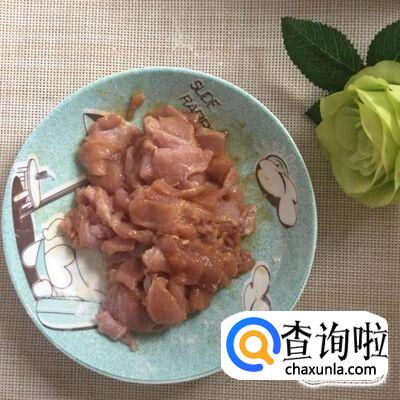 然后把瘦肉切成薄片并用适量的地瓜粉和酱油裹一下,如下图所示。