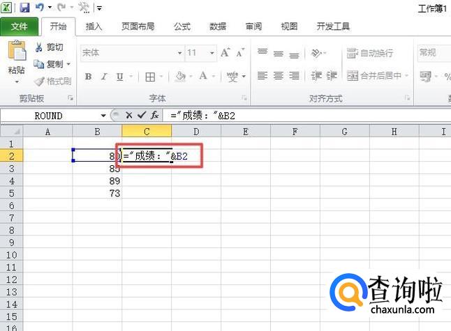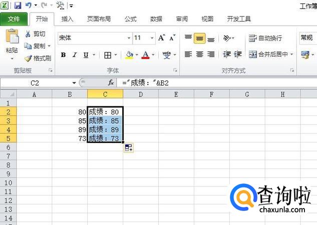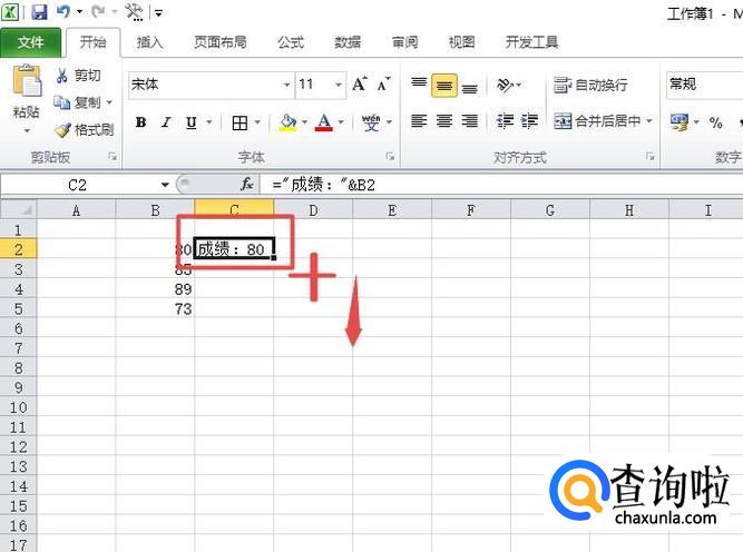 然后我们在单元格中输入="成绩:"&B2,之后我们按回车键;