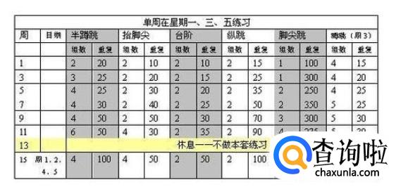 这个纵跳训练计划主要是提高自身的弹跳能力,如果严格按照训练来,训练结束后弹跳高度可提升20-30厘米。练习每组最好重复做三次,每次间隔休息尽量控制在2分钟以内。