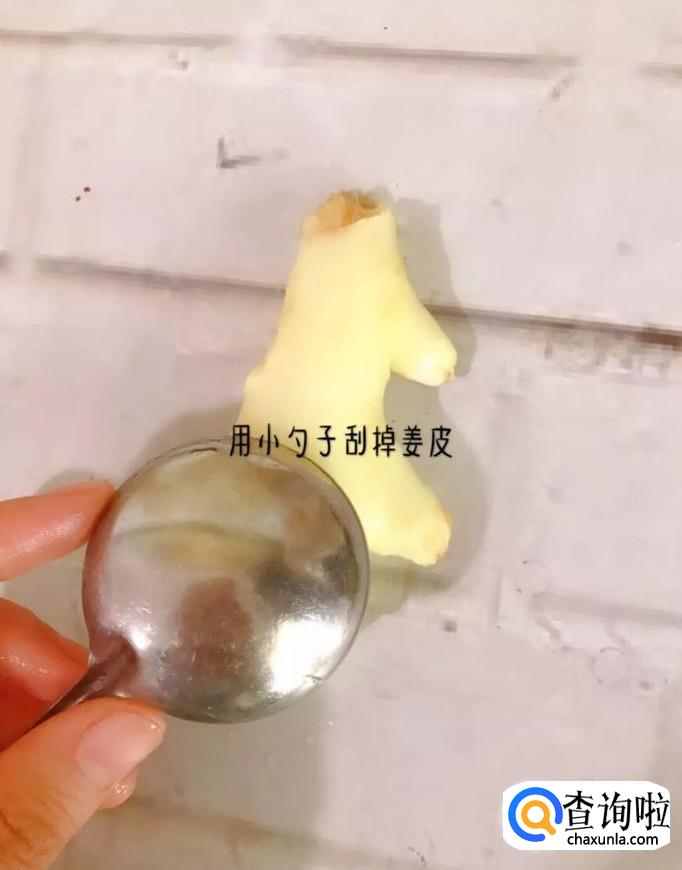 首先用勺子刮去生姜的皮,如下图所示。