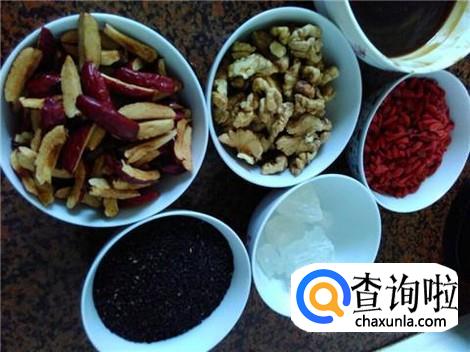 先要准备做阿胶糕的那些材料,都是很好买到的,阿胶,红枣,核桃仁,枸杞子,黑芝麻,冰糖和适量黄酒。食材全部处理好,红枣去核切成块,核桃仁芝麻都炒熟。