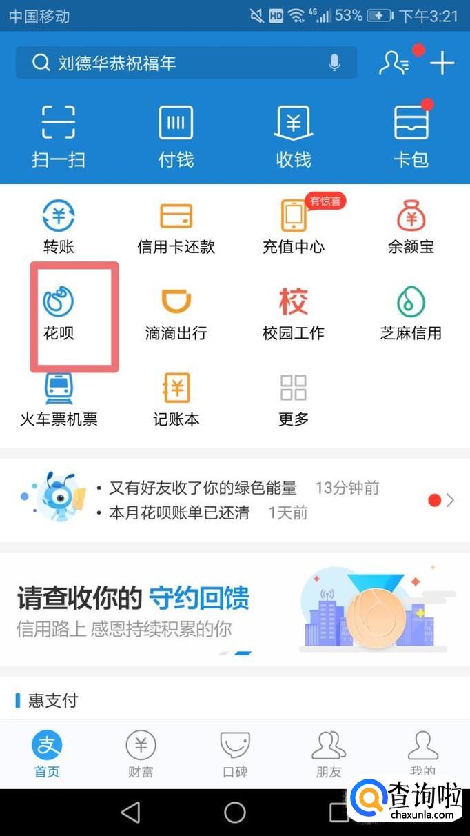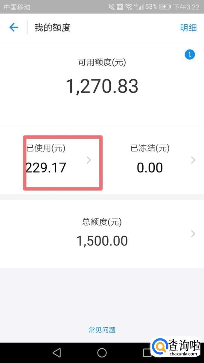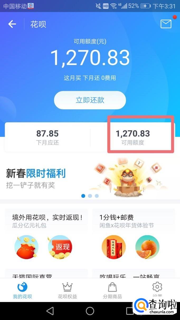 首先打开支付宝找到花呗,打开花呗,里面会显示使用了好多,剩余额度为多少,打开剩余额度。