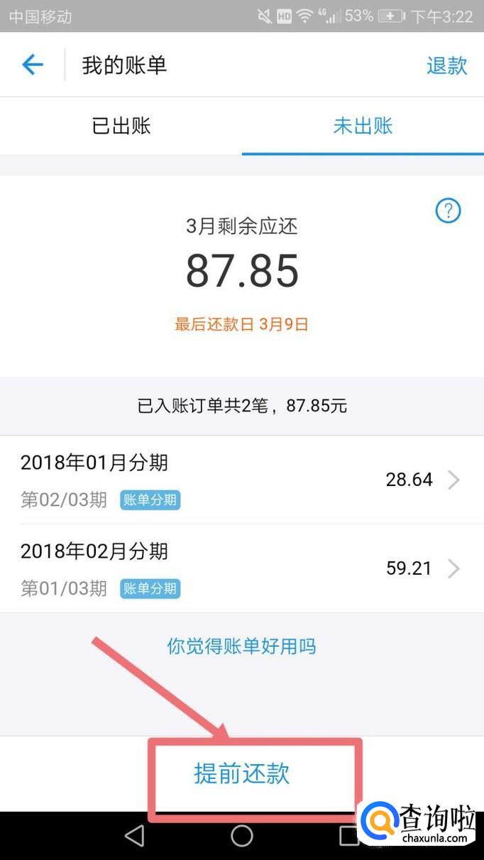 然后会显示下个月应该还的金额,最下面有个提前还款,打开它。