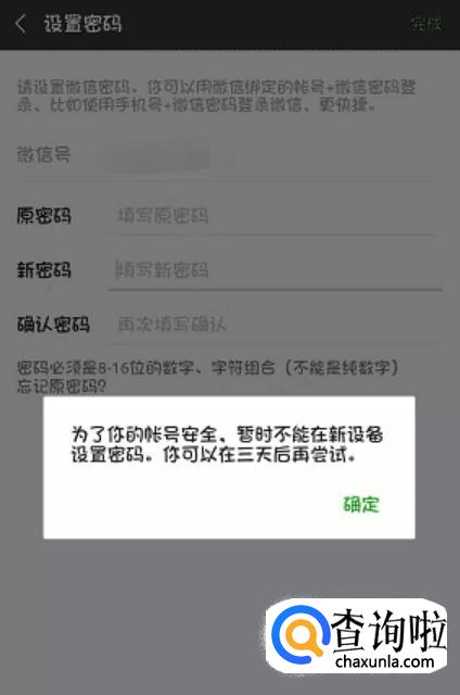 登录加载以后,会出现一个“为了你的账号安全,暂时不能在新设备设置密码,你可以在三天后再尝试”,点击确定就可以了。