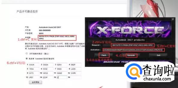 把申请号复制到注册机里面的Request中,在点击Patch;再点击Generate后复制Activeation中生成的激活码进去;