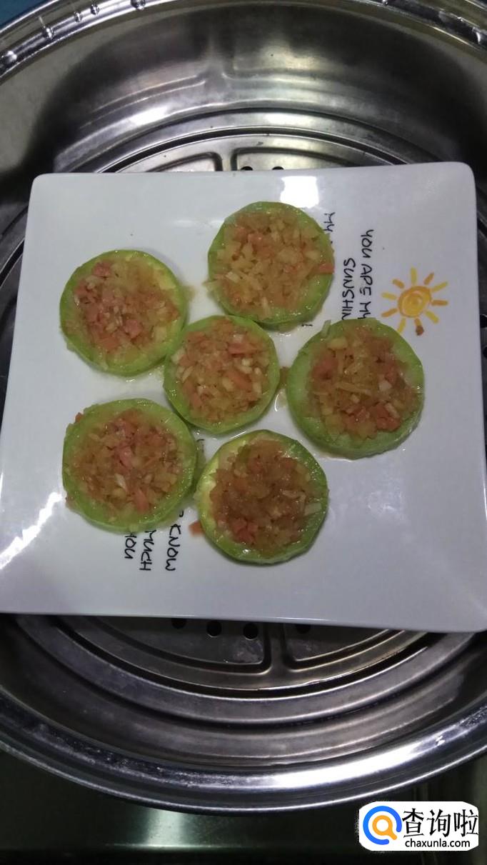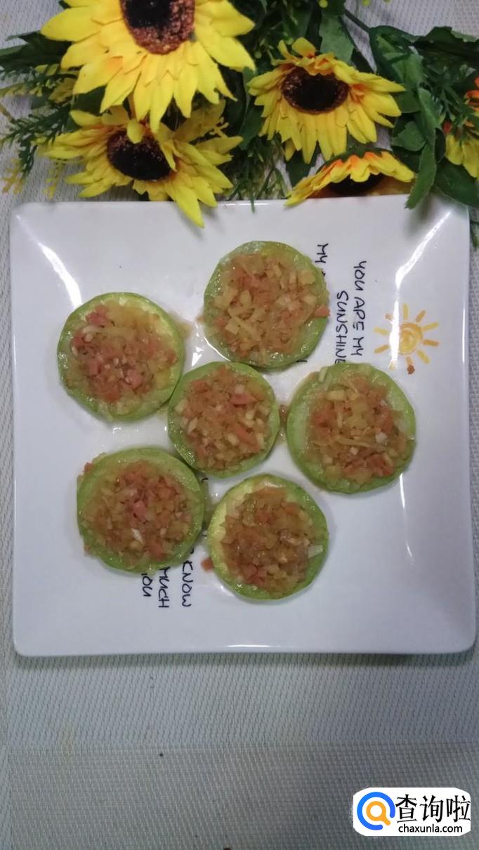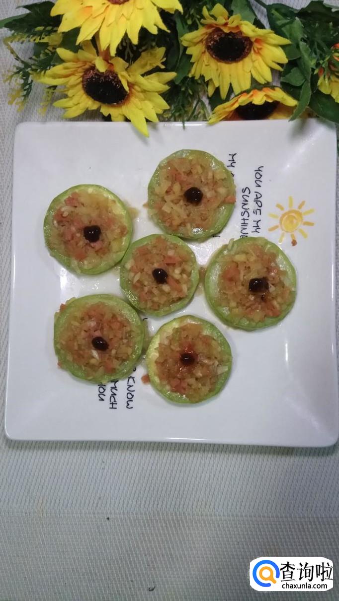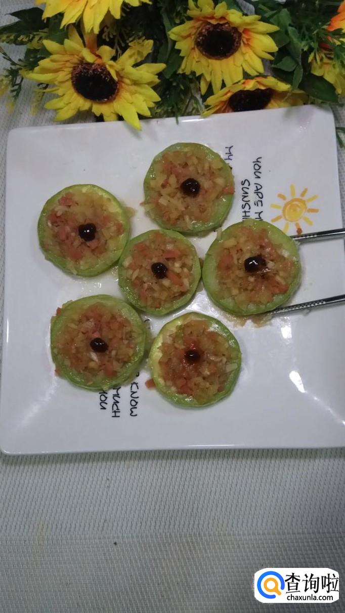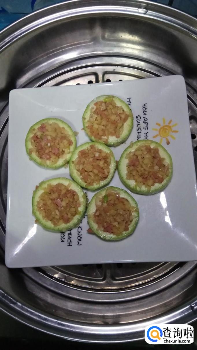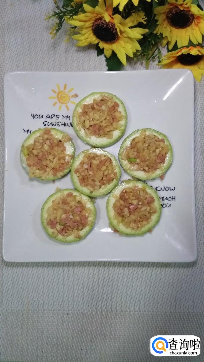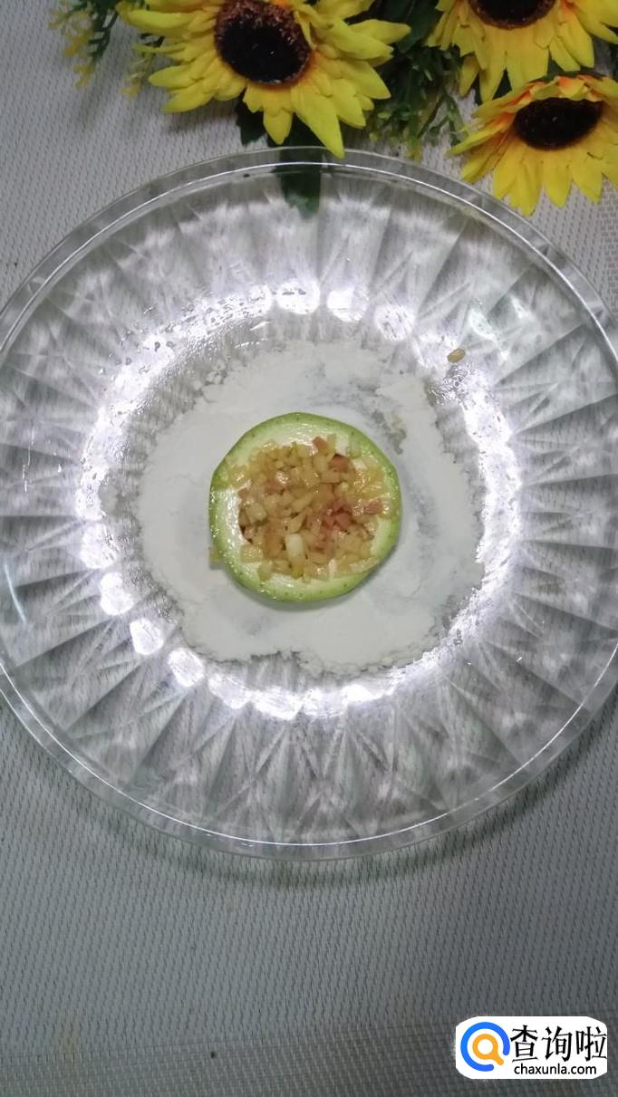 盘中放少许面粉,然后将西葫芦圈放在上面,这样做好之后不会粘盘。将做好的馅儿放在西湖芦中间,压实。