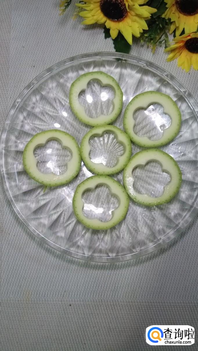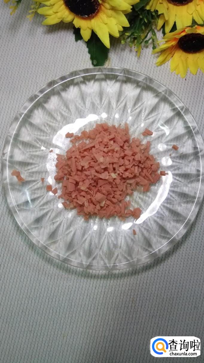 将西葫芦洗净后,切片,然后用模具刻出花形,做成西葫芦圈;然后将土豆洗净后切成小块儿,将香肠去除外衣,切成小丁儿。